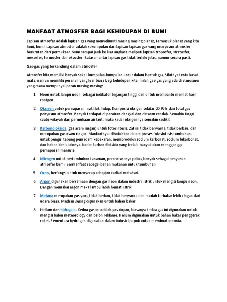 Atmosfer sangat bermanfaat bagi kehidupan manusia yang ada di bumi antara lain sebagai berikut.untuk bernafas makhluk hidup (o2)semua . Fungsi atmosfer bagi kehidupan di bumi · 1. Mengurangi radiasi matahari yang sampai ke permukaan bumi. Kondisi inilah yang berdampak buruk pada kehidupan manusia. Dalam hal ini, atmosfer mempunyai beberapa lapisan ozon yang membantu. Mengurangi radiasi cahaya · 2. Berikut ini merupakan manfaat atmosfer bagi kehidupan, kecuali. Manfaat lapisan atmosfer bagi kehidupan di bumipengatur suhusalah satu . Hubungan manusia dan lingkungan akibat dinamika atmosfer. Manfaat atmosfer bagi kehidupan manusia : Fungsi dari atmosfer bagi bumi adalah melindungi bumi dari sinar ultraviolet matahari yang sangat berbahaya serta mencegah terjadinya perubahan ekstrem saat . Atmosfer mengandung berbagai gas yang akan sangat diperlukan manusia, hewan dan. Urutan lapisan atmosfer dari yang paling dekat dengan bumi adalah….
